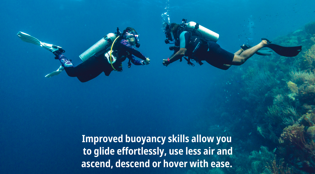 The tasks and skills in the clinic include estimating weight needed for YOUR equipment configuration using the Basic Weighting Guidelines; visualization skills; conducting predive buoyancy checks; controlled descents, ascents and safety stops; hovering; breath control for fine-tuning buoyancy underwater; maneuvering close to the bottom without touching; and post-dive buoyancy checks. We will also have you dive a buoyancy agility course while adjusting for neutral buoyancy, concentrating on an efficient kicking style, practice gliding after kicks and streamline your body/ equipment as much as possible. You'll simulate a safety stop with a full three-minute hover ... and well as do several other exercises and drills that will help you refine your buoyancy in preparation for those PPB open water dives!