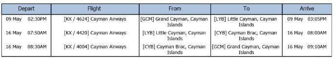 - Cayman Airway flights between Grand Cayman and Little Cayman